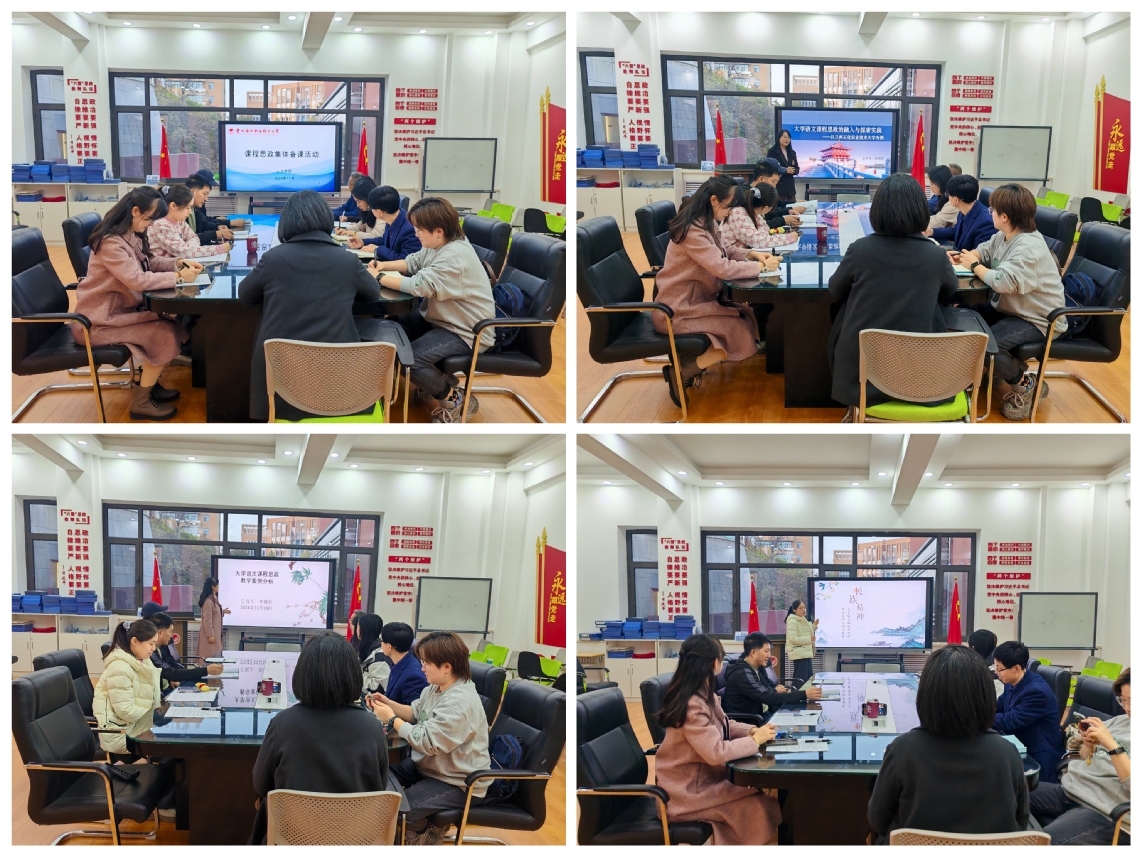集体备课活动中,那贞婷老师从课程思政的溯源、《大学语文》课程思政学科的建设优势入手,分析探讨了《大学语文》课程思政建设方法;李雅昕老师从课程思政的设计、运用现代教学工具助力课程思政实施两个方面探讨了课程思政在《大学语文》课程中的融合和创新;张若麟老师用说课的方式,探讨了如何在《大学语文》课程中将思政元素与教学内容充分融合。