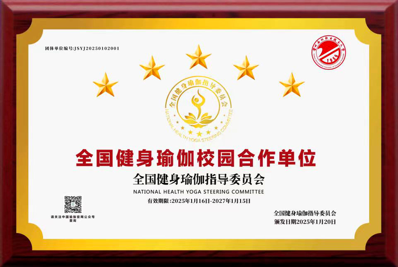 近日,国家体育总局社会体育指导中心全国健身瑜伽指导委员会授予公司"全国健身瑜伽校园合作单位"资质。